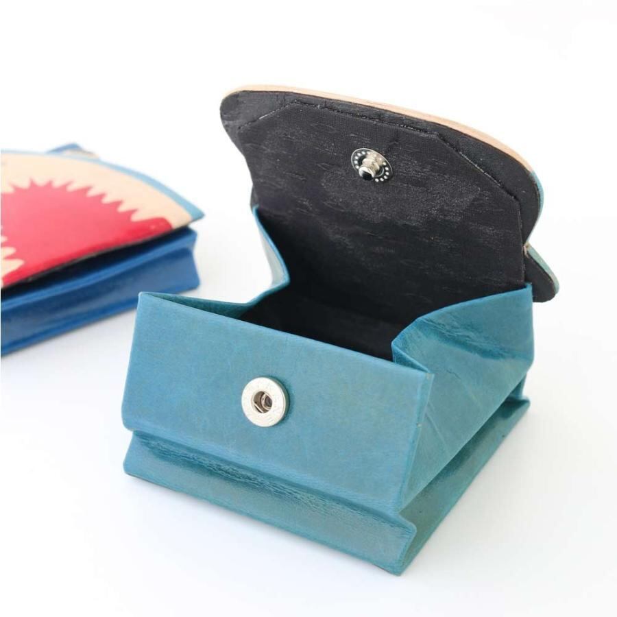 山羊革に型押しで模様をデザインし、カラフルにペイントしています。