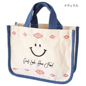 かどまるミニトート スマイルレター ボトルキーパー付き!大人気のスマイル刺繍バッグの新型が登場! 内側にボトルキーパーが付きとっても便利。ペットボトルはもちろん、タピオカドリンクやコーヒーなどのテイクアウト飲料も安心して持ち運べるのでランチのお伴にもおススメです。 スマイルマークはインバウンド需要により外国人観光客の方にも人気のモチーフ。カジュアルダウンに「はずし」アイテムとして大人の女性にも好評です。バッグのスマイルマークと文字の部分は刺繍が施されています。 スマイルlicense 生産地 インド サイズ 約H20xW26xD8cm 素材 綿100%
