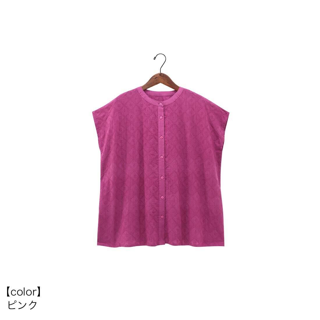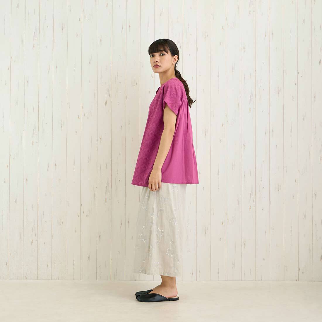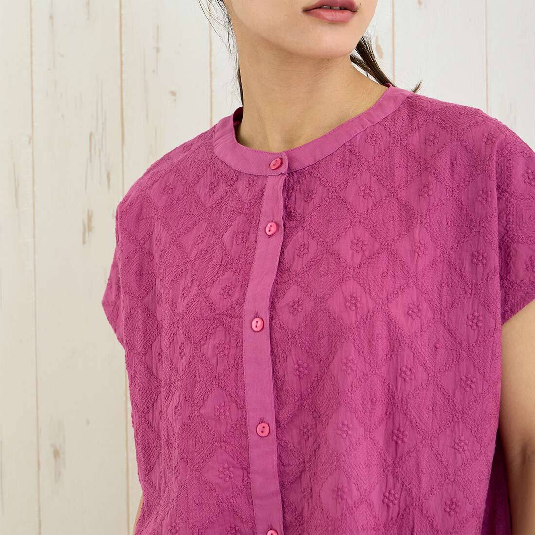 PORINAブラウス ブルジョン細い線で描いたような刺繍がポイント麻混の生地に存在感ある2配色の刺繍を袖以外の全面に施しました。手持ちのボトムスに合わせるだけで主役になるシャツブラウスです。生産地 インドサイズ 着丈SNP〜約63cm、バストフリー素材 コットンフラックス綿85%・麻15%