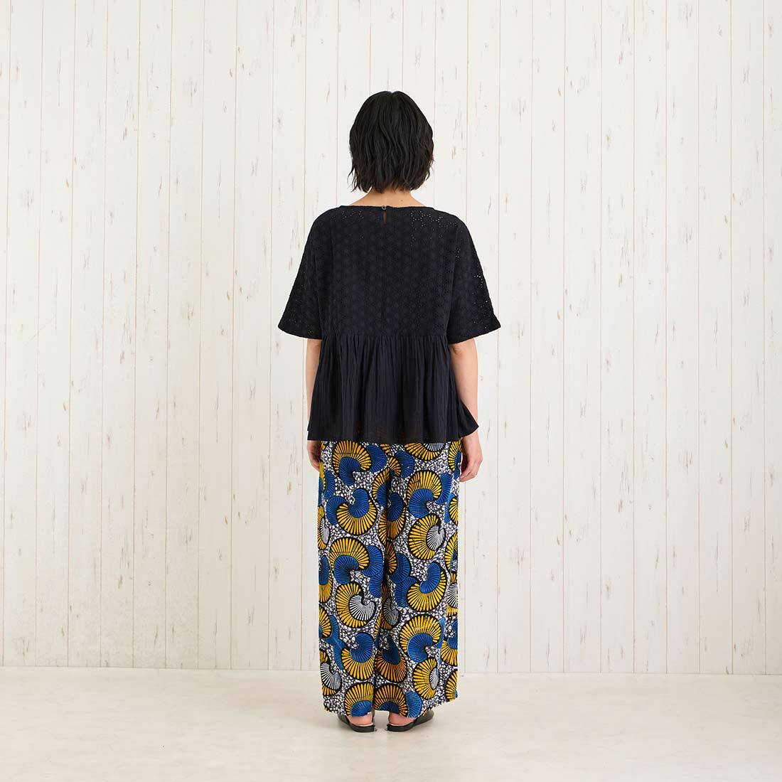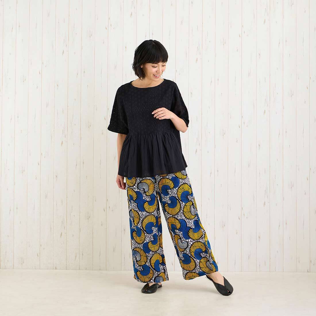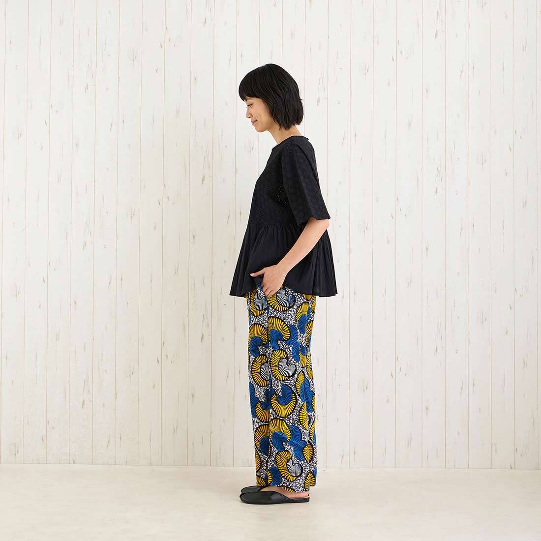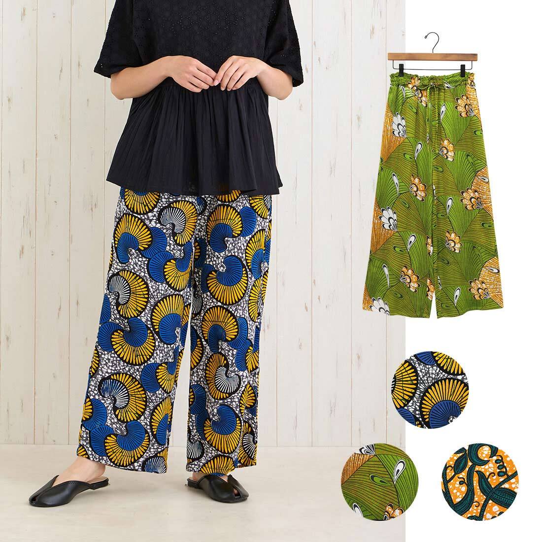 Shanti Shantiパンツ アフリカンジャカード ジャガード織のレーヨンにアフリカンプリントをのせた新感覚のシリーズ 2024 Spring 春〜初夏 ジャガード織のレーヨン生地でさらっと着られるシリーズです。目を惹く鮮やかなアフリカンプリント柄は、シンプルなトップスによく合います。 ウエストにゴムが入っているので簡単ラクチンに履けるパンツです。便利な両側ポケットつき。 生産地 インド サイズ 着丈CF〜約93cm ウエストゴム上がり約68cm ヒップ約110cm 衣料サイズガイド 素材 レーヨンジャカード レーヨン100%