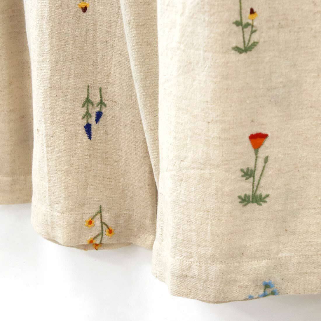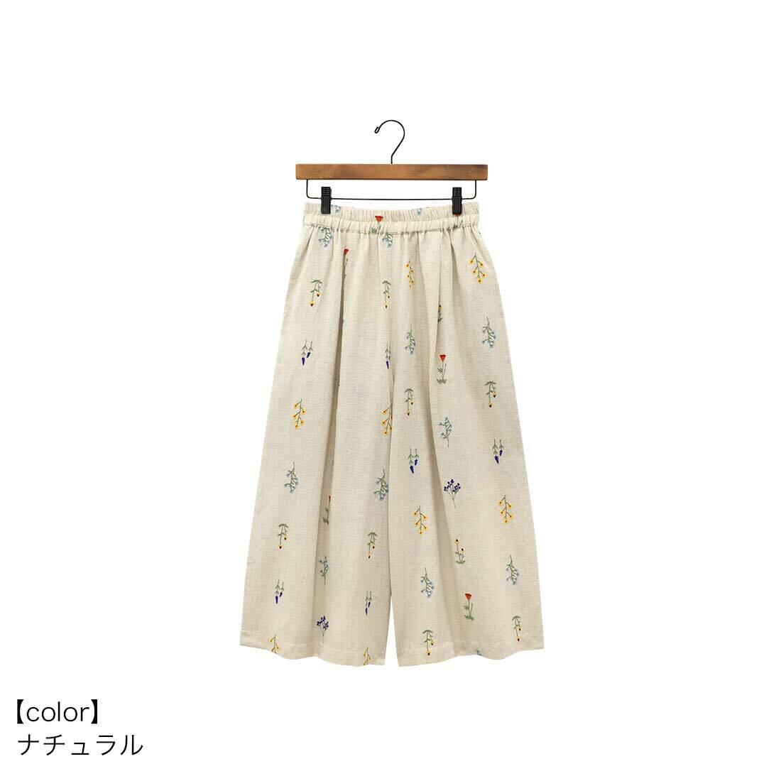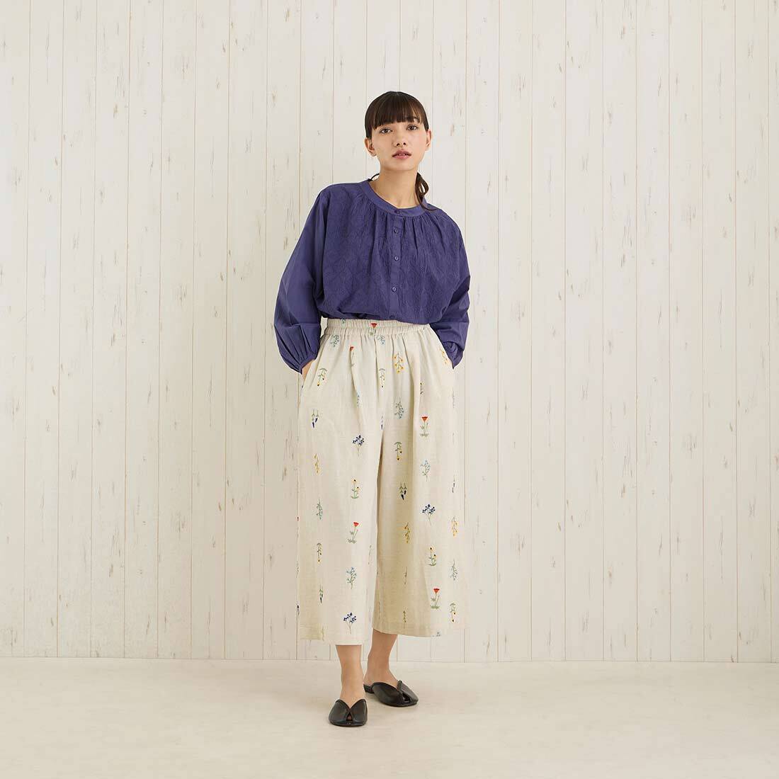 PORINAパンツ フルール草花の刺繍がポイントのナチュラルなシリーズ2024 Summer 初夏〜盛夏可愛らしい草花の刺繍を少し地厚な麻混の生地にのせました。足首がすっきりとして見える丈感で、地厚の生地でも涼し気に履いていただけます。可愛くなりすぎない大人のナチュラル服です。生産地 インドサイズ 着丈CF〜約85cm、ウエストゴム上がり約66cm重量:270g素材 コットンフラックス綿90%・フラックス10%