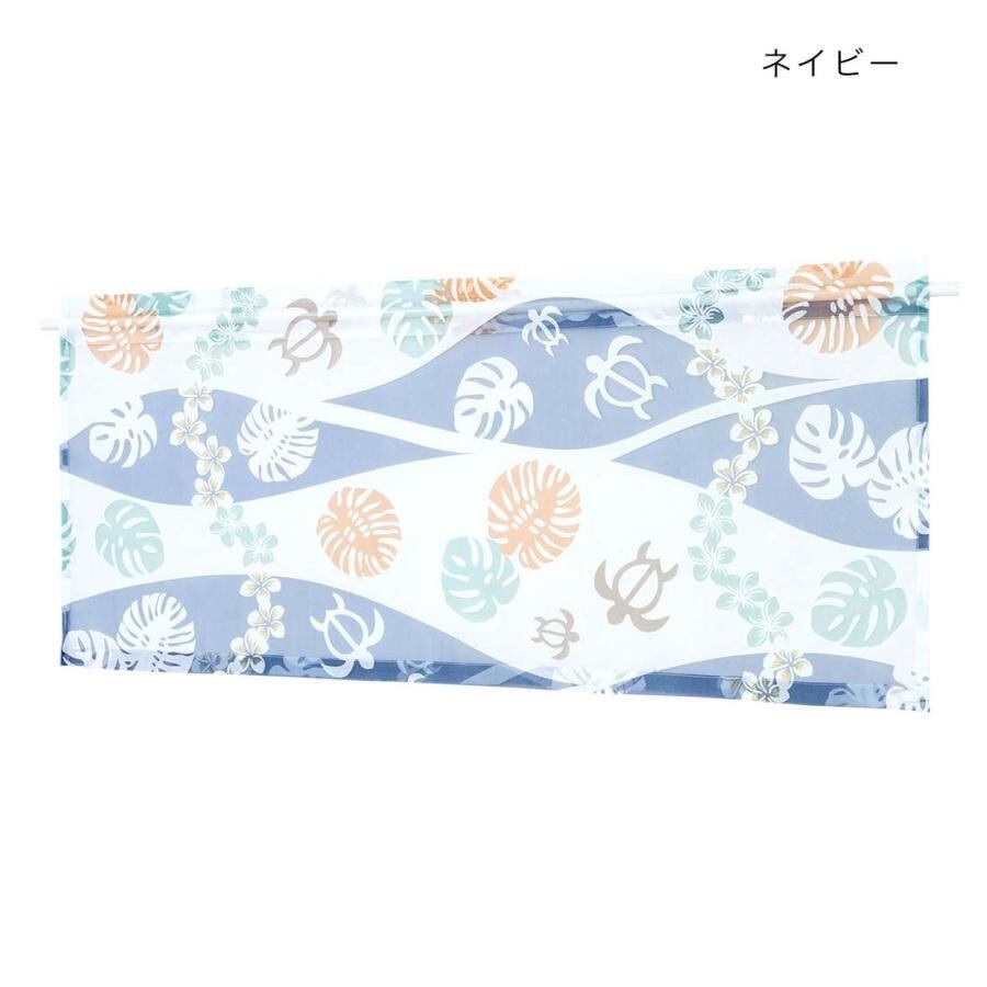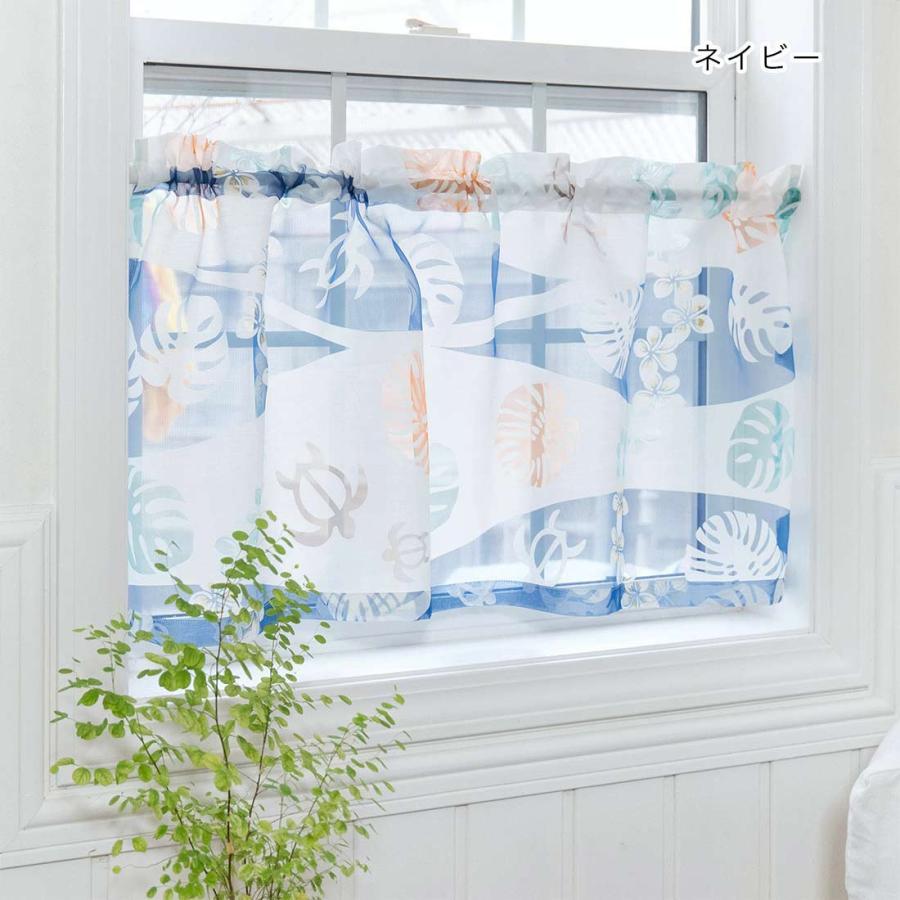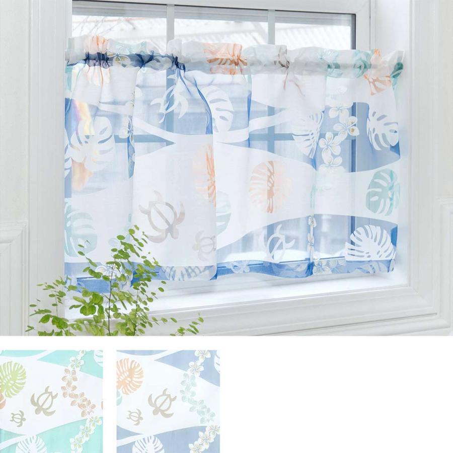 カフェカーテン モアナホヌ 透かし柄が美しいオパール生地 ホヌ、モンステラ、レイをモチーフにしたハワイアンなカフェカーテンです。爽やかなカラーが涼しげ。 オパール加工によりポリエステルの部分だけを残して透かし柄を描いているので、光に透けて映し出される影もとてもキレイです。