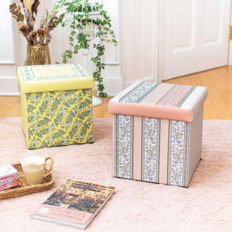 収納BOXスツール マルセイユストライプ ストライプと小花が調和した、エレガントなデザインの収納BOX 南仏の歴史あるテキスタイルをイメージしたトワルパント(木版プリント)風デザイン。 プロヴァンスの自然を連想させる色彩はお部屋を華やかにしてくれます。 BOXの中にたっぷり収納できて、ふたをすればスツールに。座面のクッションの座り心地も実はなかなかGOODなんです。 使用しない時は、折りたためるので場所を取りません。 子供部屋だけでなく大人の方へもおすすめです。 生産地 中国 サイズ 約31×31×H31cm 素材 PVC、MDF