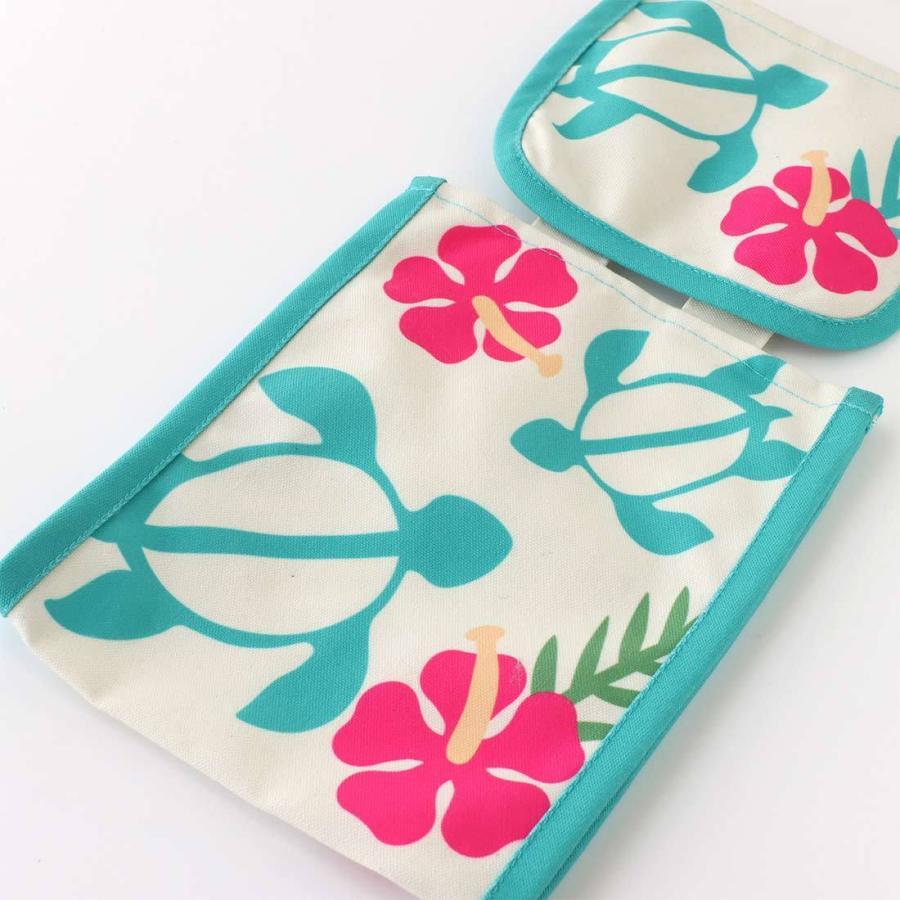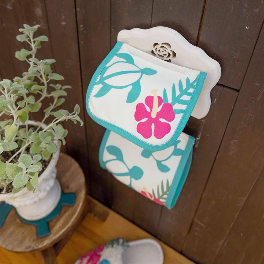 トイレットペーパーホルダーカバー ワレアホヌ トイレもうきうきハワイアン♪ ワレア=ハワイ語で「やすらぎ」、ホヌ=ハワイ語で「ウミガメ」。 人気のハワイアン柄がトイレタリー商品になって登場!ホヌとハイビスカスの柄でいつでも常夏気分が味わえます。 お揃いのトイレタリーセット、スリッパと揃えて、トータルコーディネートがオススメ★