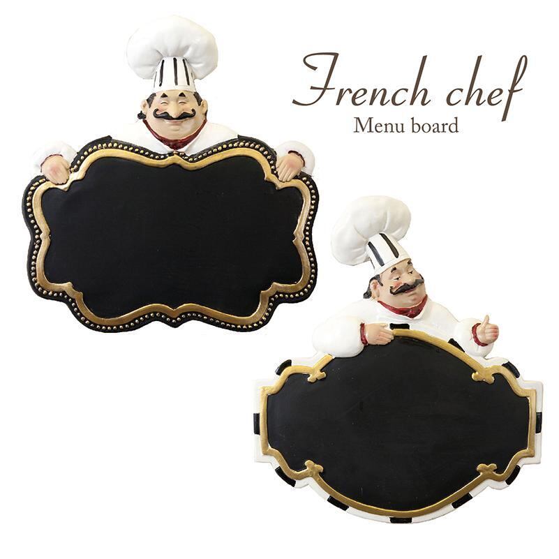 フレンチシェフ メニューボード 黒板 シェフがメニューボードを持ったデザインです。 壁掛け 愛嬌があって可愛い。 チョークでの書き込みができます。 ※チョークなどは付属しません。 <041-1>正面シェフスマイル サイズ:約 W.23 × D.2 × H.24 cm重量:約 880 g <041-2>横向きシェフGOOD サイズ:約 W.22.5 × D.2.5× H.26 cm重量:約 830 g ※ペン・チョーク・消すものは付属しておりません。