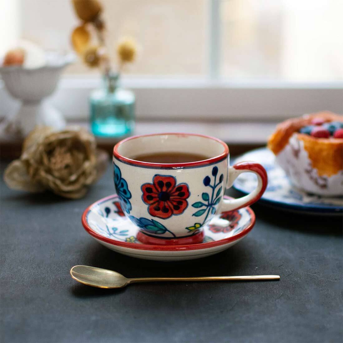 プリヤ カップ&ソーサー インド伝統柄ペイントのテーブルウェアです。 ぽってりとした形がかわいらしいプリヤ。 ハンドペイントの温もりあるデザインが食卓を華やかに彩ってくれます。