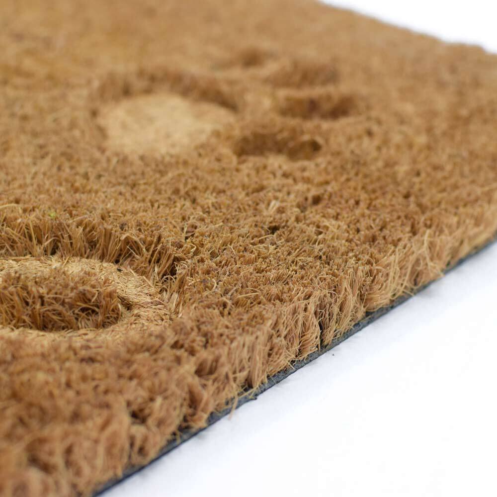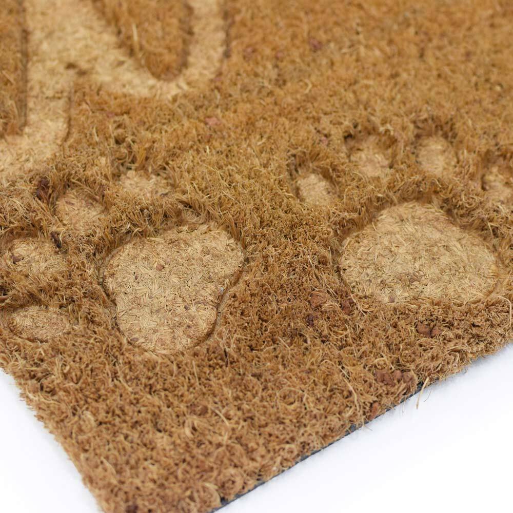 ココヤシ繊維に型押し加工で文字と柄をデザインしたコイヤーマットです。肉球のあとが可愛くお客様をお出迎え。