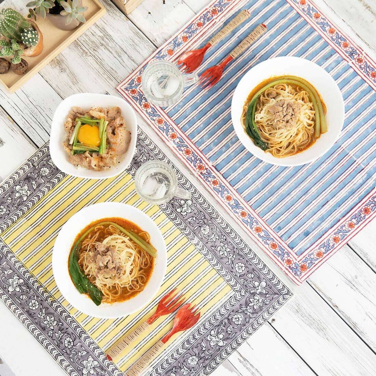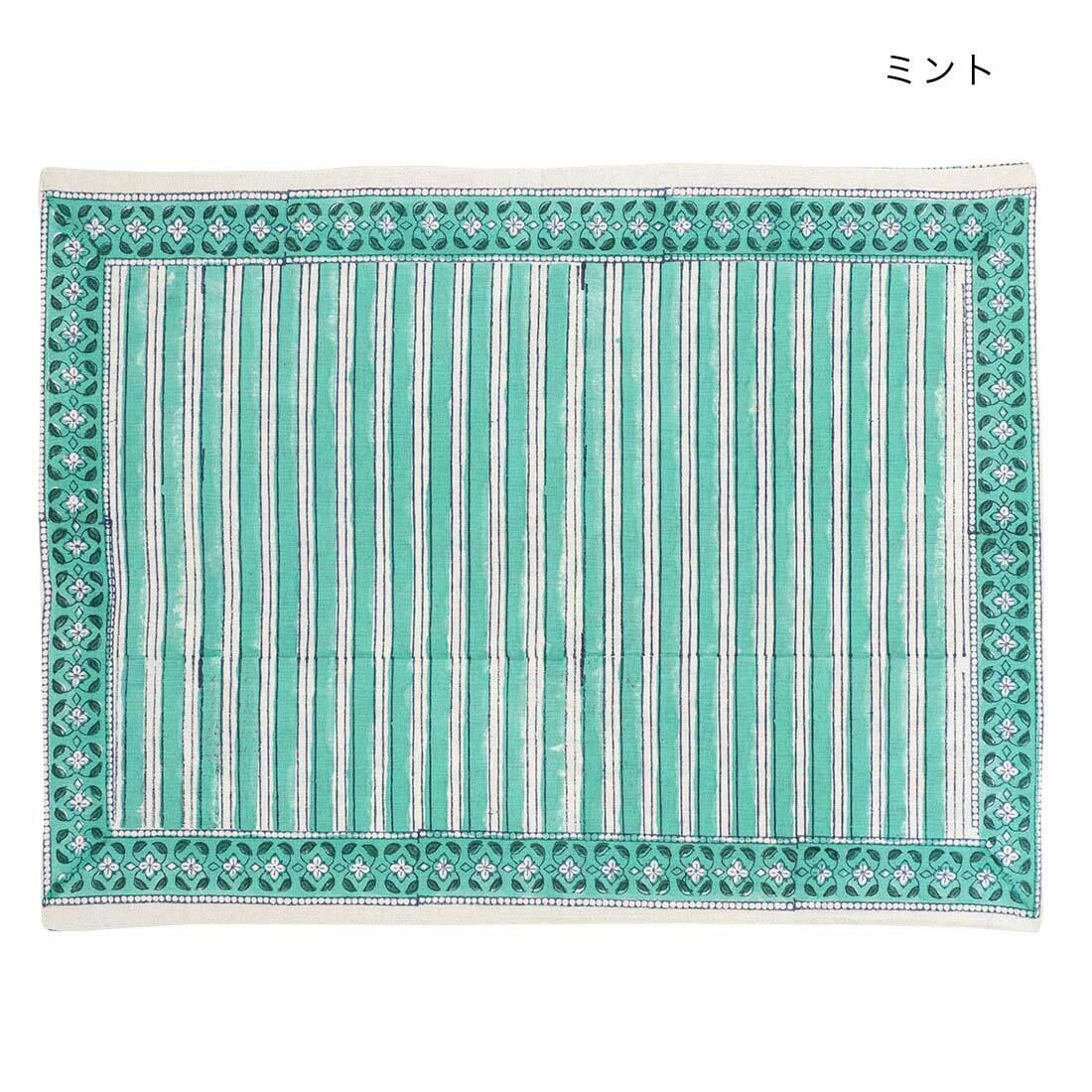 ランチマット アマービレブロックプリント 可憐なモチーフとかわいい配色が乙女心をくすぐります インドのブロックプリントでデザインされたボタニカル柄ランチマットです。 「アマービレ」は「やさしく、愛らしく(演奏する)」という音楽用語。毎日に「愛らしさ」をプラスしてくれます。 フェミニンな柄がテーブルを彩ります。リバーシブルなので気分に合わせてお楽しみいただけます。 「ブロックプリント」は木版を使って、職人がひと版ひと版、手でスタンプを押すように生地の上にプリントするインドの伝統的な技法です。 アマービレブロックプリント 生産地 インド サイズ 約44×34cm 素材 綿100%