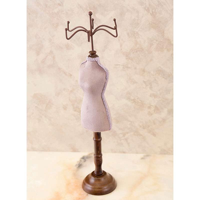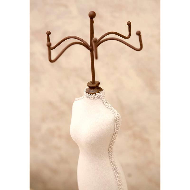 トルソーモチーフのオシャレなアクセサリースタンドです。 お店の展示品の様にお部屋でもお気に入りのアクセサリーをかわいく飾れます ペンダントやブレスレッドのディスプレー、 店舗装飾、展示会のディスプレーにも◎ 上部のフックは差し込みタイプなので取り外してトルソーモチーフの置物としてもお使い頂けます。 約 Φ12 x H39 cm 木(本体・スタンド部分) 布(柄部分) 鉄(上部パーツ) ※洋服を飾るトルソーではございません。サイズにご注意ください。