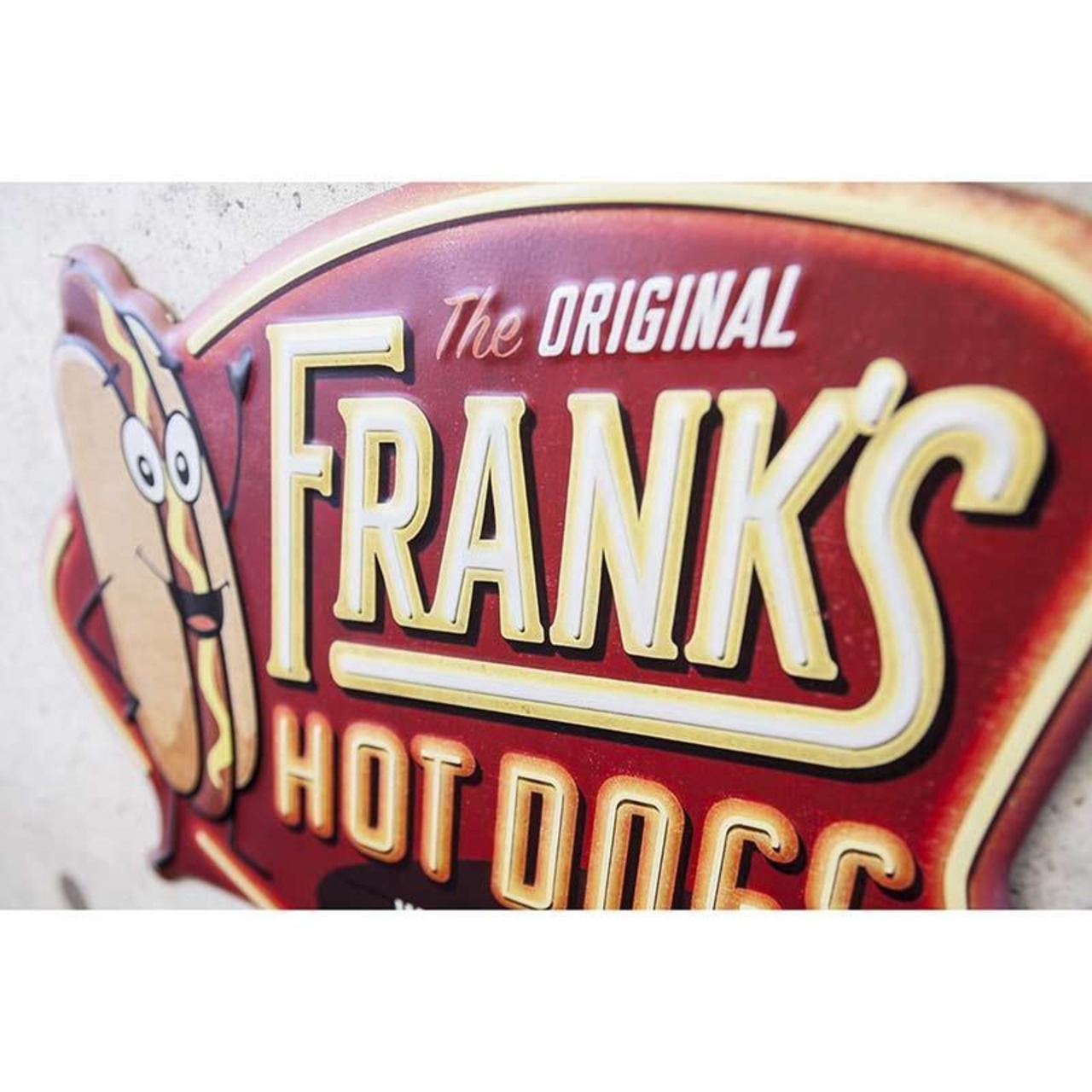 FRANK'S HOT DOGS アイアンのポップなデザイン看板 キッチンカーや店舗装飾、春夏のインテリアにメタルテイストでおしゃれ サイズW.50 x D.1 x H.40 cm 生産地:中国 素材:鉄 お店の入口装飾、インテリア、お部屋にもサインにも